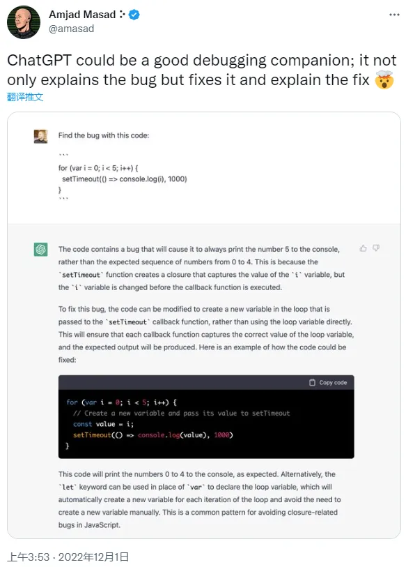 美国的代码托管平台 Replit 的 CEO 也发帖称赞 ChatGPT 的代码能力:不仅能够解释 bug,还能修复 bug 并解释如何修复”。