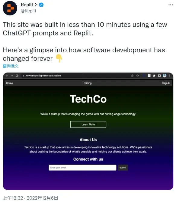 使用 ChatGPT 给出的提示,你还可以 10 分钟创建一个网站,即使是小白程序员也能利用它生成的代码开发一个生产级应用程序,Replit 因而称 ChatGPT “从此改变了软件开发”。