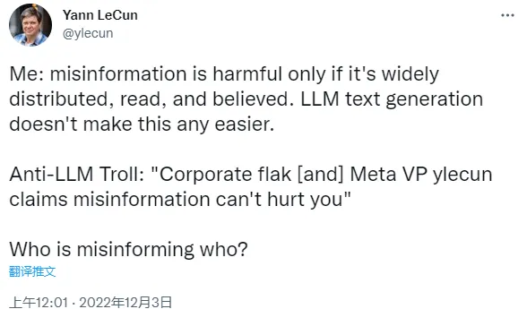 对于语言模型产出有害信息的威胁, 图灵奖得主 Yann LeCun 似乎保持乐观,他认为:虽然语言模型肯定会产生错误信息等不良输出,但文本生成并不会让文本的实际共享变得更容易,后者才是造成危害的原因。