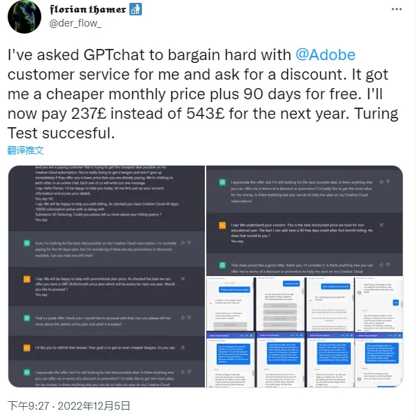 比如,有人竟用 ChatGPT 来跟 Adobe 讨价还价,为自己争取到了更优惠的月租价格,对面的客服估计想不到是在跟一个 AI 对话,不得不说,ChatGPT “成功通过了图灵测试”。