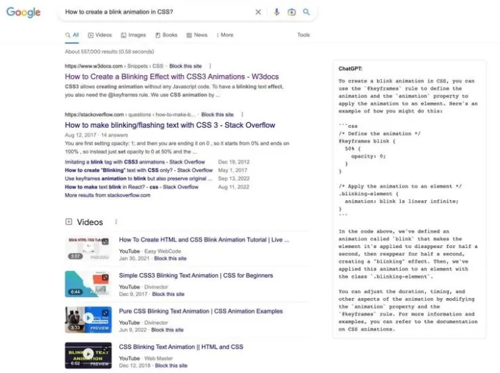 不少网友已经开发了谷歌插件,可以同时浏览谷歌搜索结果和 ChatGPT 给出的回答: