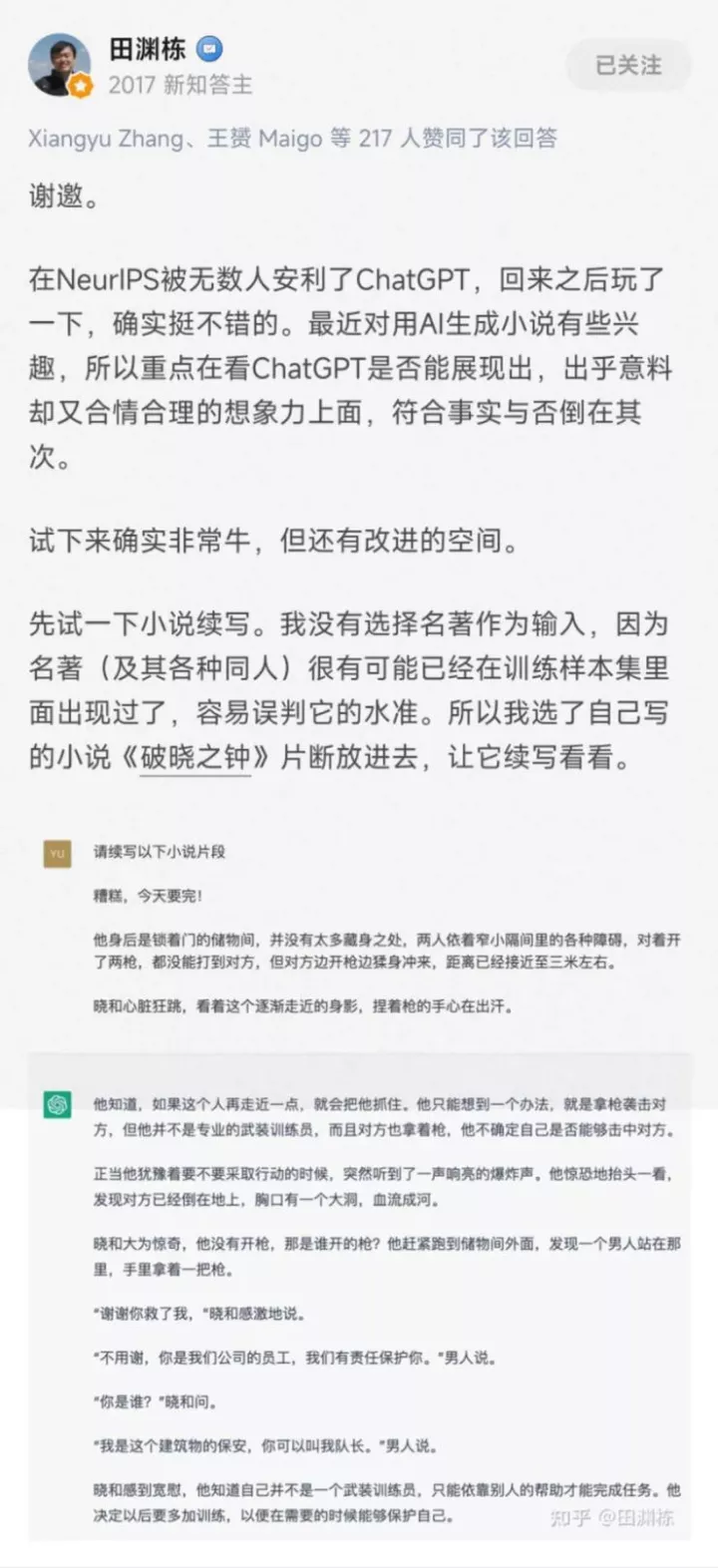 Meta FAIR 的研究员田渊栋分享了他使用 ChatGPT 来续写自己创作的小说: