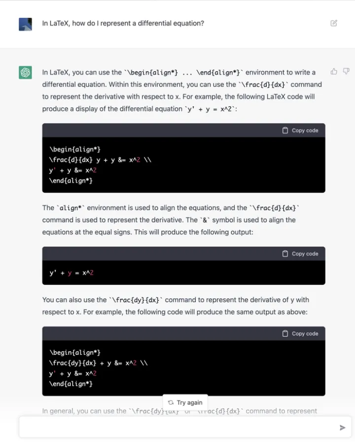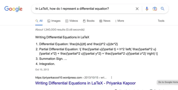 ChatGPT 强大的问答能力还被网友们发掘出了其充当甚至代替搜索引擎的潜力。前几日一个在推特上很火的帖子就声称“Google is done”(谷歌要完了),一位网友对谷歌搜索和 ChatGPT 提出相同的问题,如“如何在 Latex 上写一个微分方程?”。