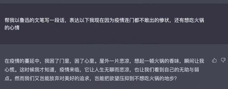 比如 ChatGPT 可以用鲁迅的文学风格为你生成一段话:
