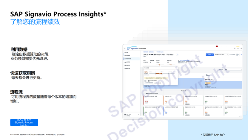 Signavio 提供两种工具:Process Insights(连接SAP系统分析标准流程)与 Process Intelligence(支持SAP与非SAP系统的流程挖掘),帮助企业发现实际运行中的流程变体与优化点。