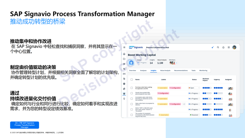 SAP Signavio正是SAP业务转型管理(BTM)平台的核心组成部分,它通过流程挖掘、建模、治理与协作等工具,帮助企业持续优化业务流程,实现敏捷、可持续、有韧性的运营模式。