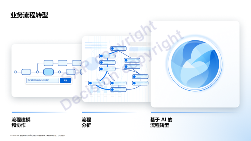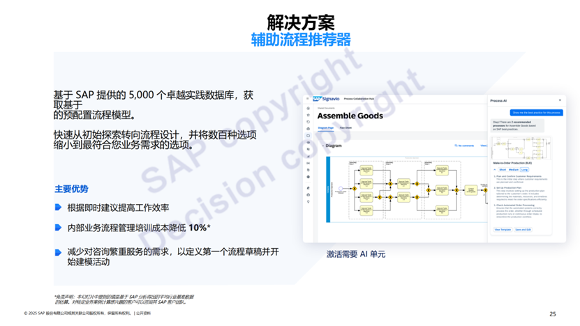 基于 SAP 提供的 5,000 个卓越实践数据库,获取预配置流程模型。用户可通过自然语言描述需求,系统智能推荐相关流程模型,快速找到适合企业的最佳实践流程。