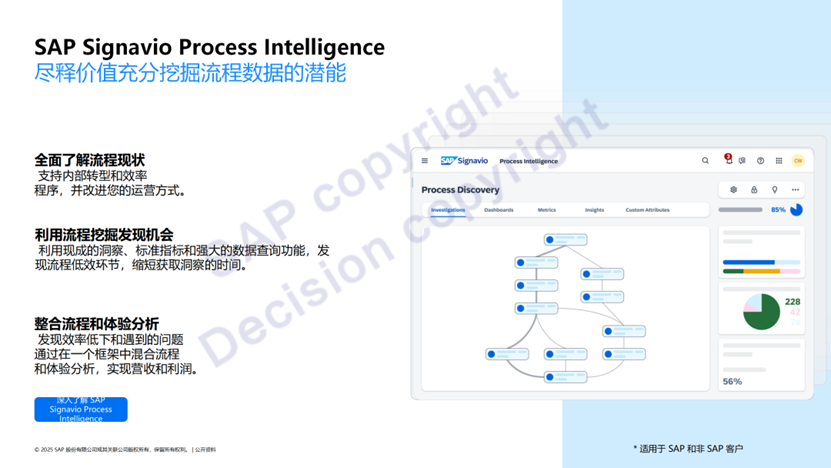 另一个工具叫Process Intelligence,支持SAP与非SAP系统(如OA系统、Ariba等)的流程挖掘,全面掌握跨系统流程运行情况,发现整合中的瓶颈与改进机会。