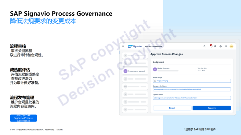 Signavio 提供流程审批、发布、审计等治理功能,帮助企业去更好的进行流程审计、成熟度评估、合规审计等,确保流程从设计到执行全程可控、合规,降低变更风险与成本。