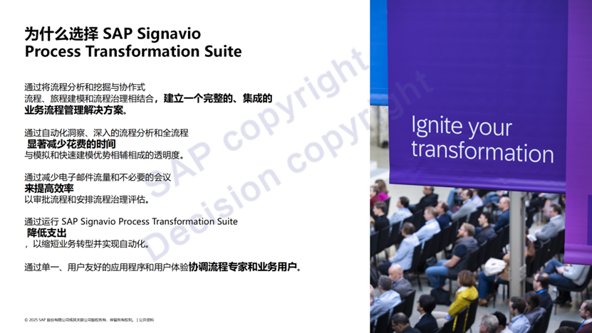SAP Signavio 帮助企业通过流程视角洞察业务运营现状,构建未来流程,通过引入AI等先进手段,提升业务流程的效率,让企业的业务流程与成本控制变得更合理。