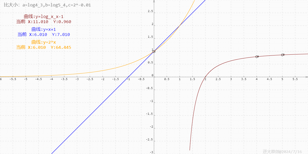 【高中数学/指数函数、对数函数】比大小:a=log4_3,b=log5_4,c=2^-0.01 【问题】比大小:a=log4_3,b=log5_4,c=2^-0.01【解答】ab比较相对容易,这两个数是函数式y=logx_x-1的具象,此函数是一个在(1,+∞)区间内的单调递增函数,x越大,底数和真数越接近,结果也就趋向于1。因此,从增函数而言,log5_4>log4_3.即b>a;而c是函数式y=2^-...