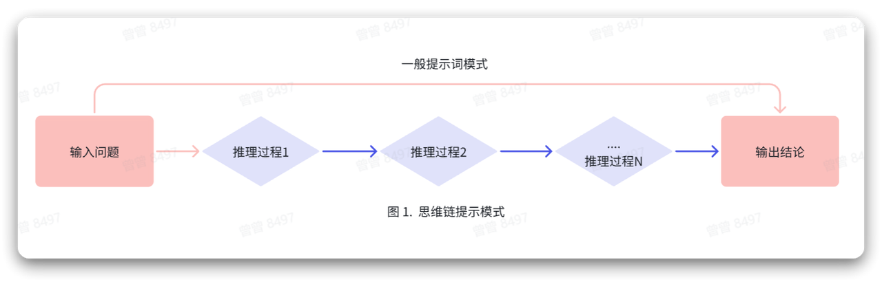 和以前那种提示词模式(问题、答案)不一样,思维链的提示词模式是(输入问题—思维链—输出结论)。