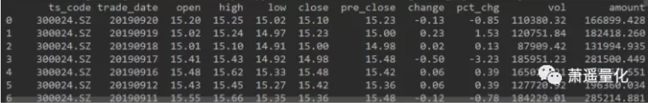 这是获取股票300024从2018年1月1号到2019年9月20号的所有前复权数据的代码。运行后返回的数据如下。