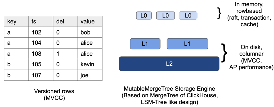 目前 TiFlash 的方案是,存储引擎使用类 LSM-Tree 的存储架构,并且使用 MVCC 来实现和 TiDB 一致的 SI 隔离级别。LSM-Tree 架构可以很好的处理 TP 类型的高频小 IO 写入;同时又有的一定的局部有序性,有利于做 Scan 优化。