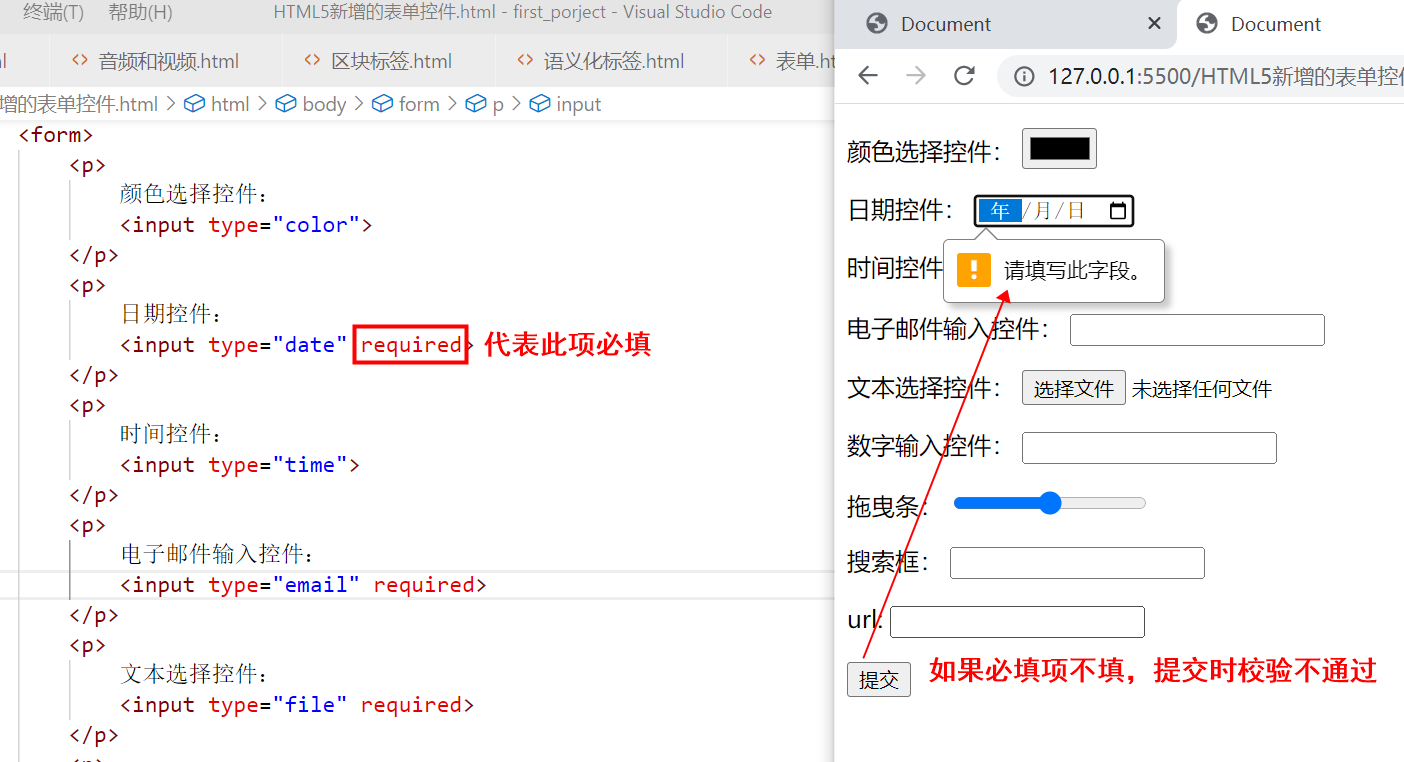 required属性代表此项为必填项,提交表单前必须填写,否则不能提交表单。