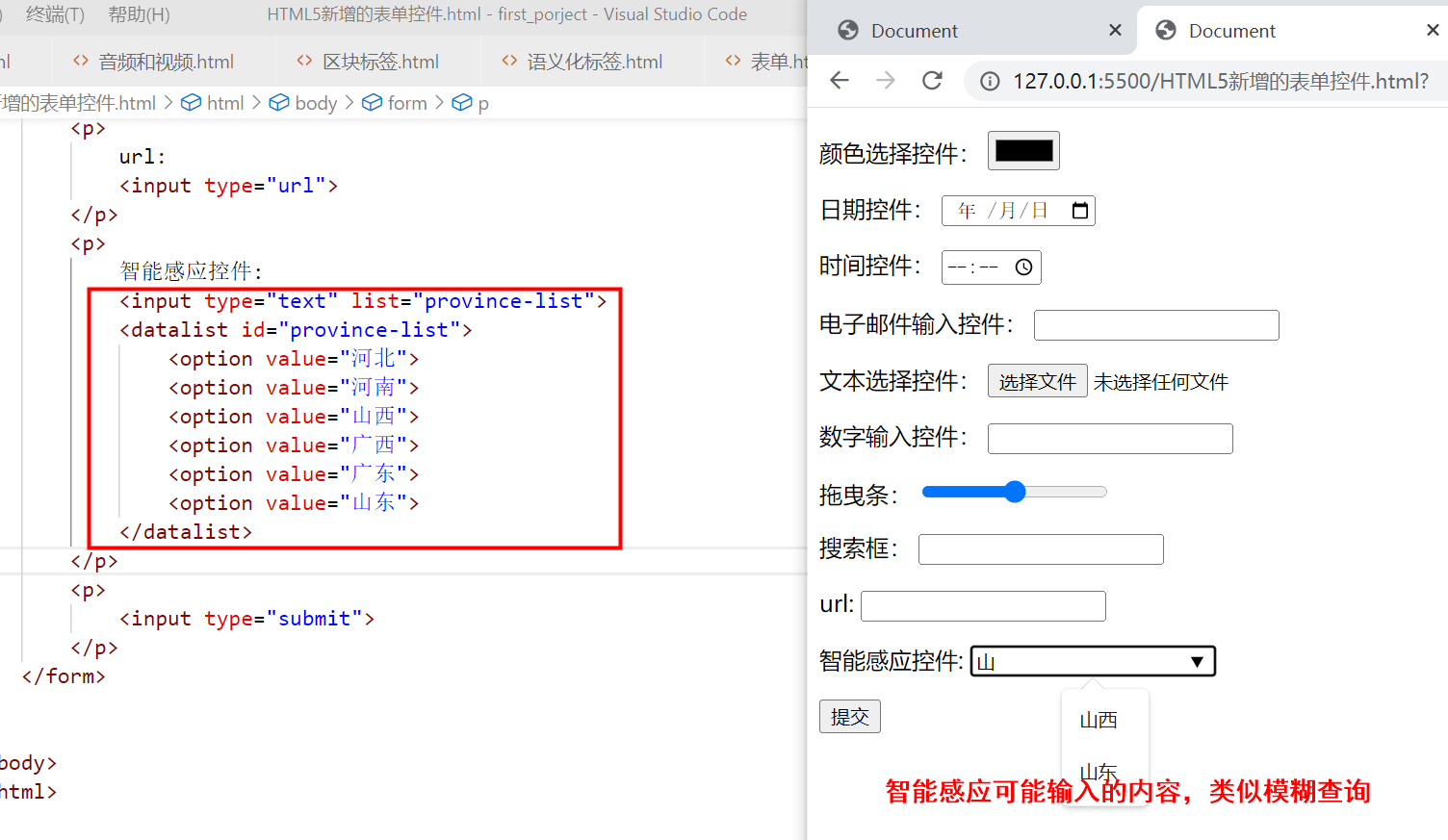<datalist>控件可以为输入框提供一些备选项,当用户输入的内容与备选项文字相同时,将会显示智能感应。