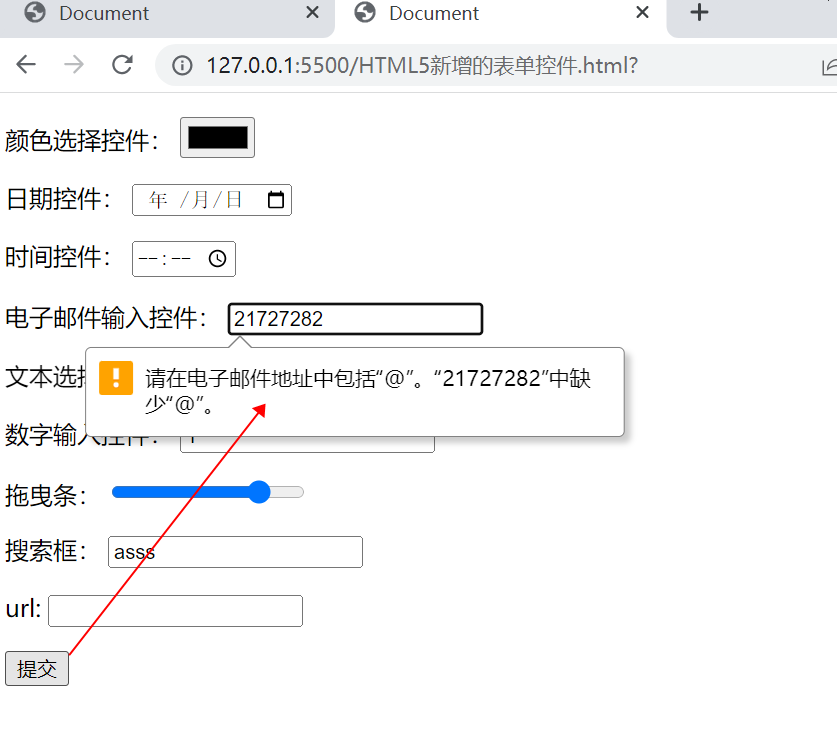 上面的电子邮件输入控件看起来和普通的单行文本框差不多,其实是有区别的,随便输入几个字符,点击提交按钮就可以看出差别: