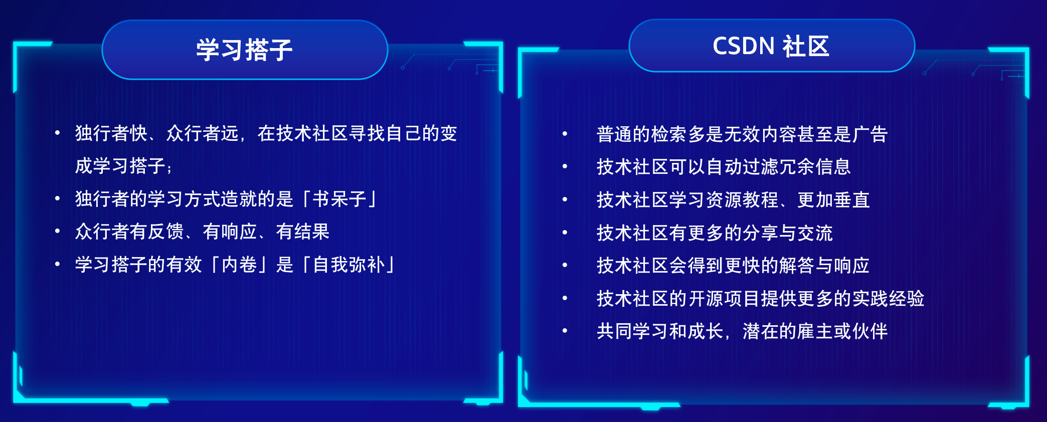 说到了「编程搭子」就不得不提一下「技术社区」,学习编程的快速提升方法是找到知识体系范围和重点,但是作为门外汉的编程初学者来说,往往不得门而入。而技术社区就是这样一个门,一个优秀的数去不仅学习教程与资源更加的丰富,而且在细分领域更加的垂直,社区内有更多相同领域方向的知识分享与交流,同样的在社区提出一个问题也会得到更快的解答与响应。除此之外,我们还可以在技术社区完成跳槽换工作的需求,我有一位朋友在18年的时候在CSDN更新自己的技术博客就被某B字开头的大厂的领导挖过去了,待遇非常的Open~