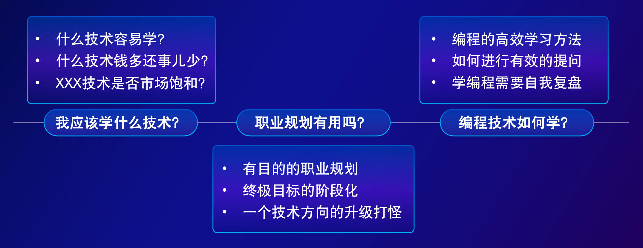 可以看的出来,之所以会问这些问题是因为他们没有目标,对将要学习的知识点未知、对未来从事的职业没有清晰的认知,甚至可以说没有职业规划;我个人一直都认为,在学习编程技术之前,是肯定要对自己的未来4年的学习生活、毕业之后的工作有一个清晰的认知与规划的。如果说这一点都做不到,相信编程的学习过程也是会事倍功半的,尤其是没有目的的随大流的为了学习编程而学习编程。