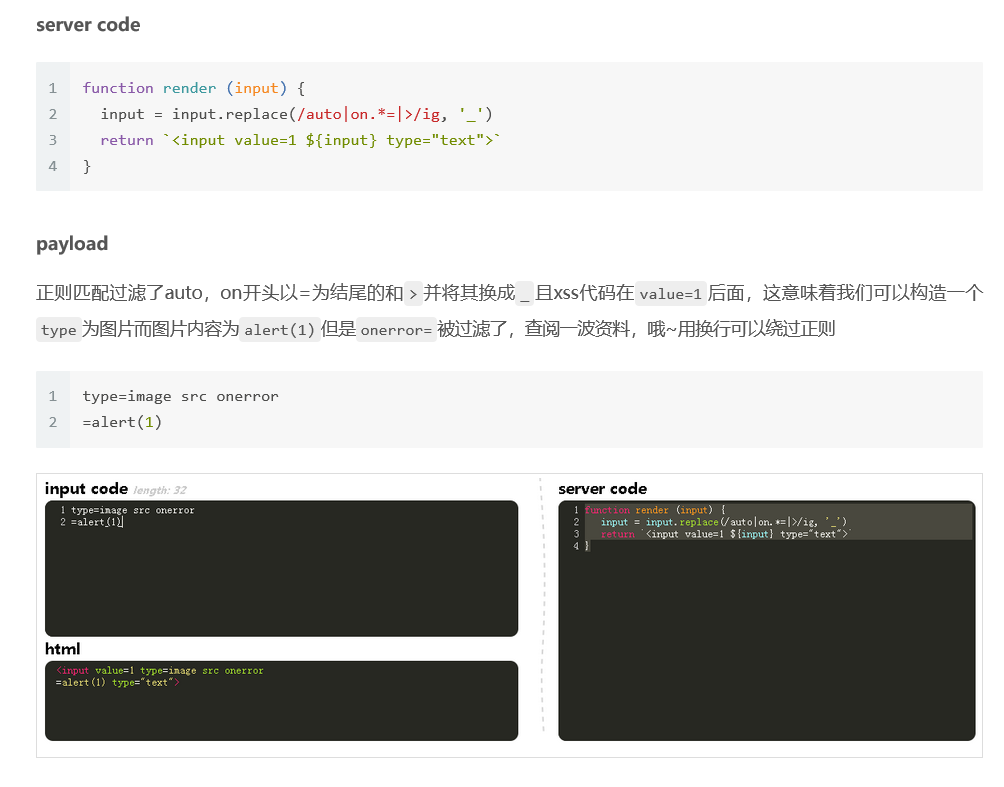 根据源码可以看到,这里直接接收keyword参数,然后变为小写 之后使用正则来过滤<>之间的内容,这意味着所有的类<>标签都不能用了 其实input是有一个比较奇葩的payload的,那就是 <input type=image src=x οnerrοr=alert(1)> 这个payload会把input当做img标签来用 此处用 " type=image src=x οnerrοr=alert(1) " 闭合前后双引号,构造即可