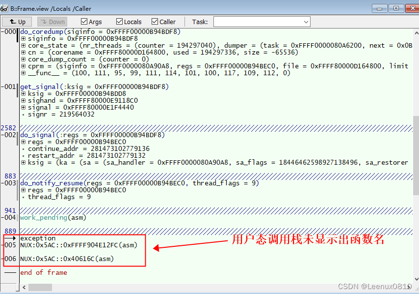 在只加载了linux vmlinux符号表的情况下,trace32 只能显示内核态的调用栈函数信息,无法显示用户态调用栈的函数信息: