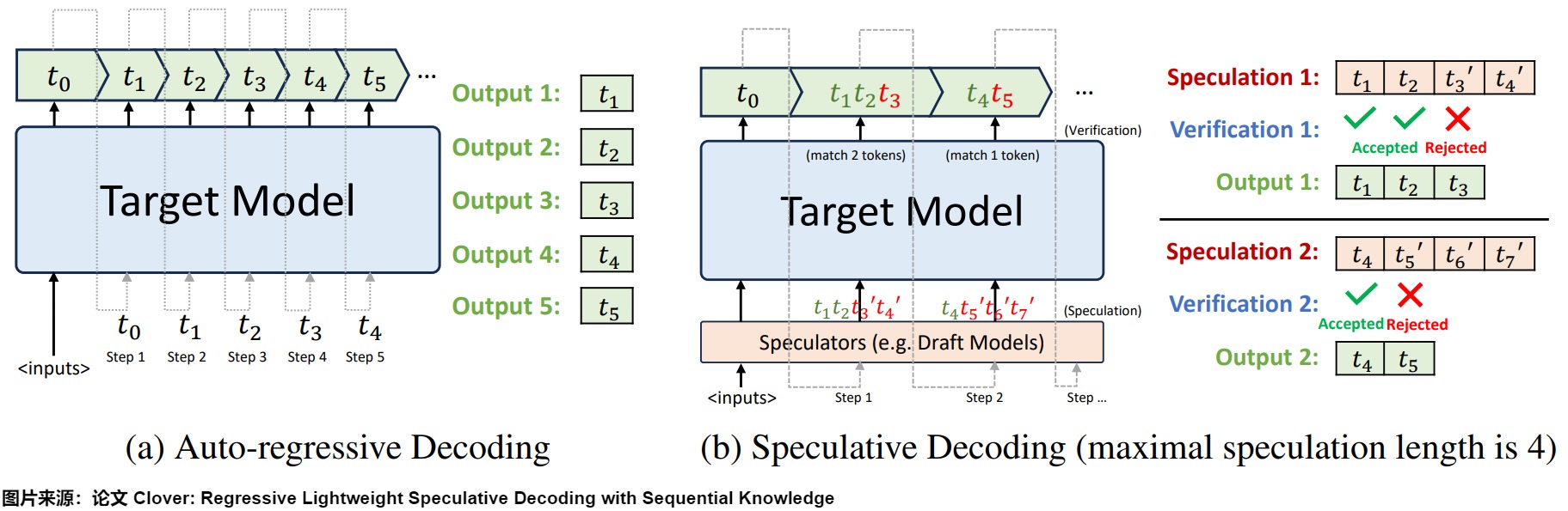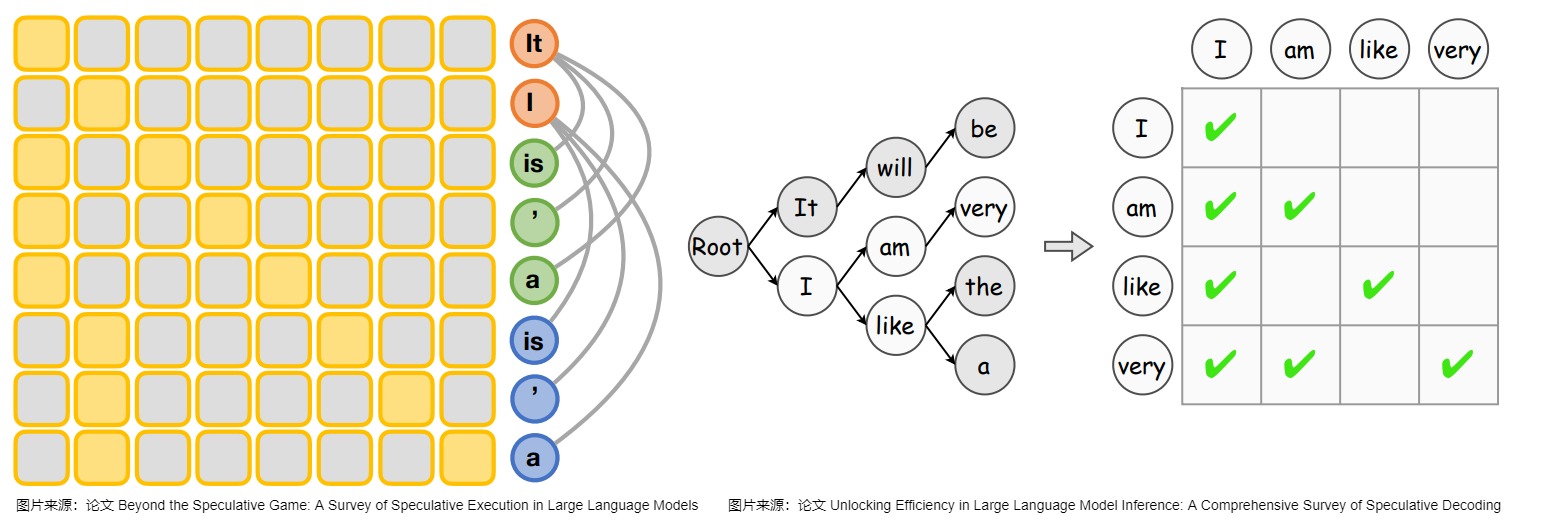 下图左侧是自回归解码模型,右侧是投机解码机制。