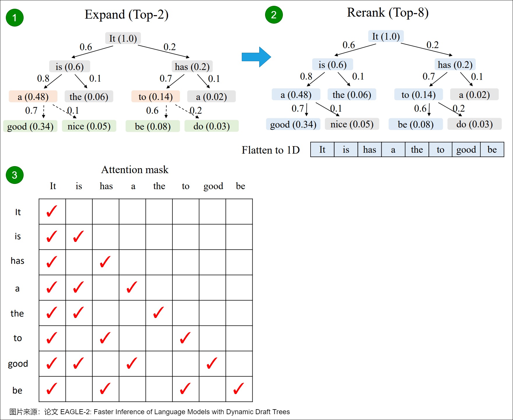 再比如,下图给出了EAGLE-2的Token Tree Verification。树的边上的数字表示草稿模型的置信度得分,块内括号中的数字表示节点的值。在扩展阶段,我们从当前层(橙色块)中选择值最高的前2个节点作为草稿模型的输入,并将生成的token(绿色块)连接到草稿树。在重新排序阶段,我们从所有节点(蓝色块)中选择值最高的前8个节点,将其展平为一维序列以形成最终草稿。然后,我们根据树结构来构建注意力掩码,确保每个token只能看到其祖先节点。