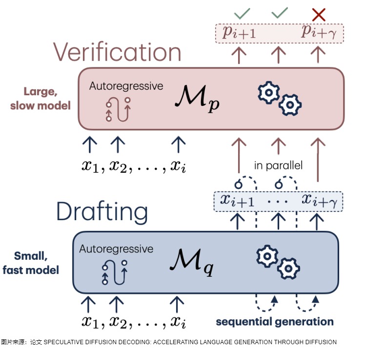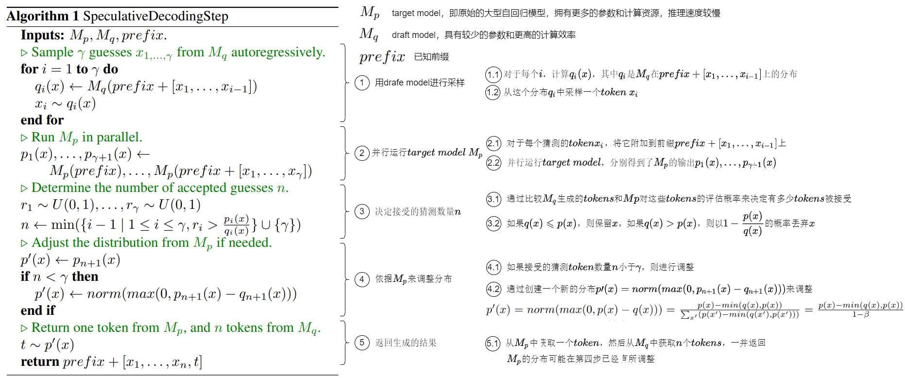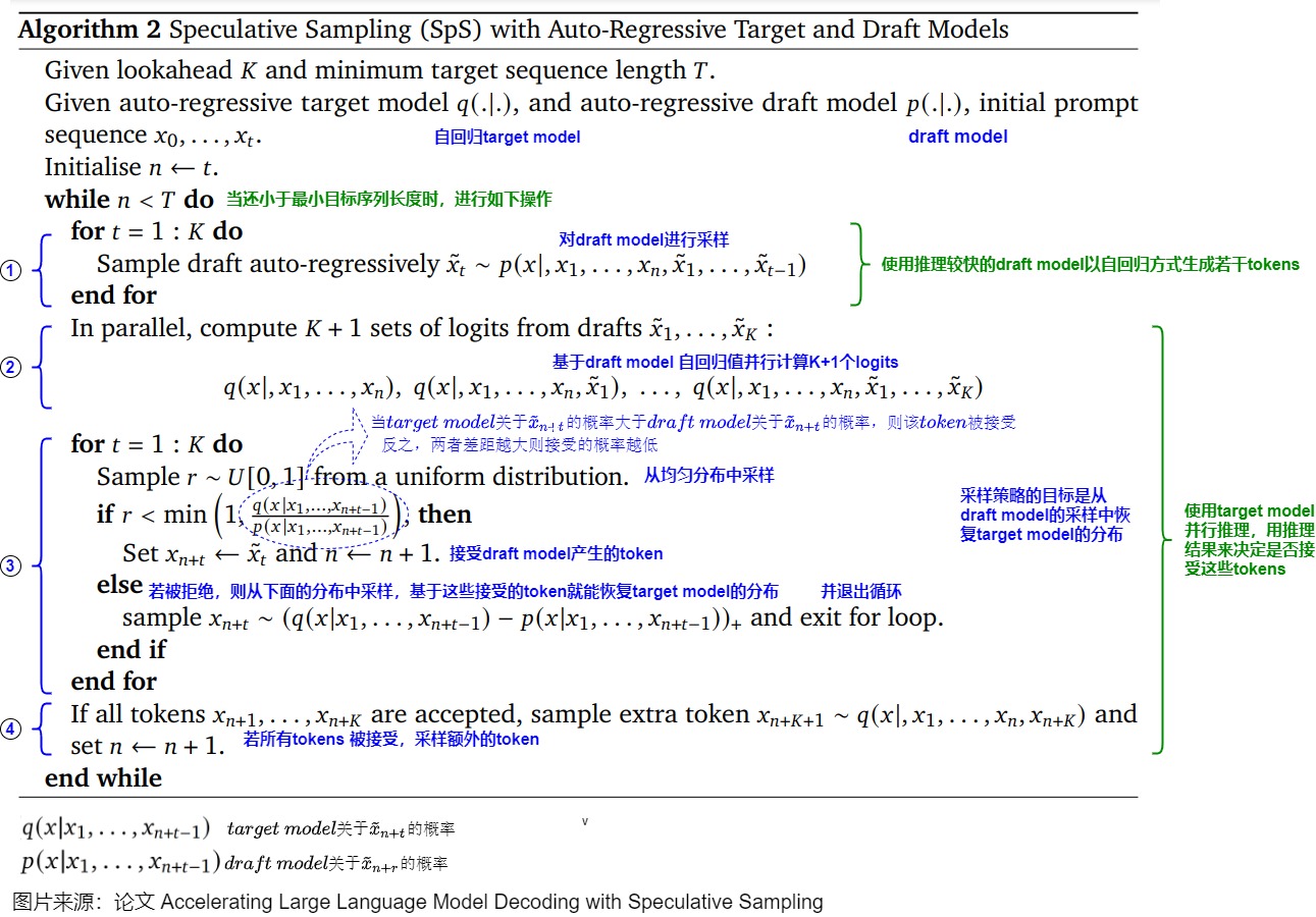- target model用来评估采样结果\审核修正。target model通过并行计算多个token来从自回归模型中采样,用推理结果来决定是否使用draft model生成的这些tokens。