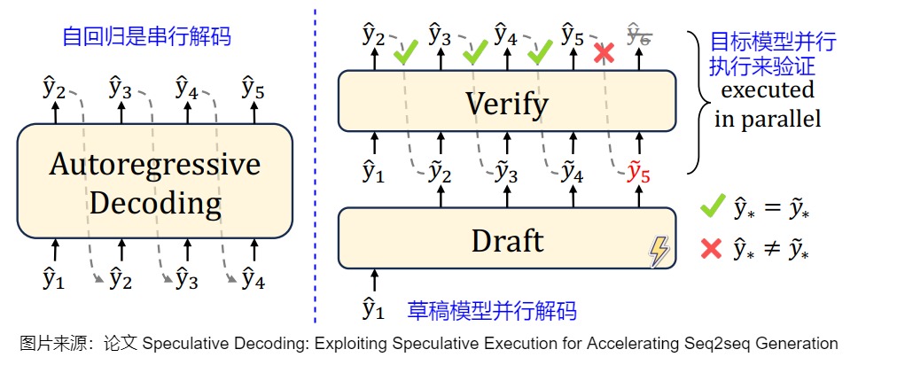 论文“Speculative Decoding: Exploiting Speculative Execution for Accelerating Seq2seq Generation”是第一篇提出 Speculative Decoding 这个词的文章,也确立了使用 draft-then-verify 这一方法加速 Auto-Regressive 生成的范式。