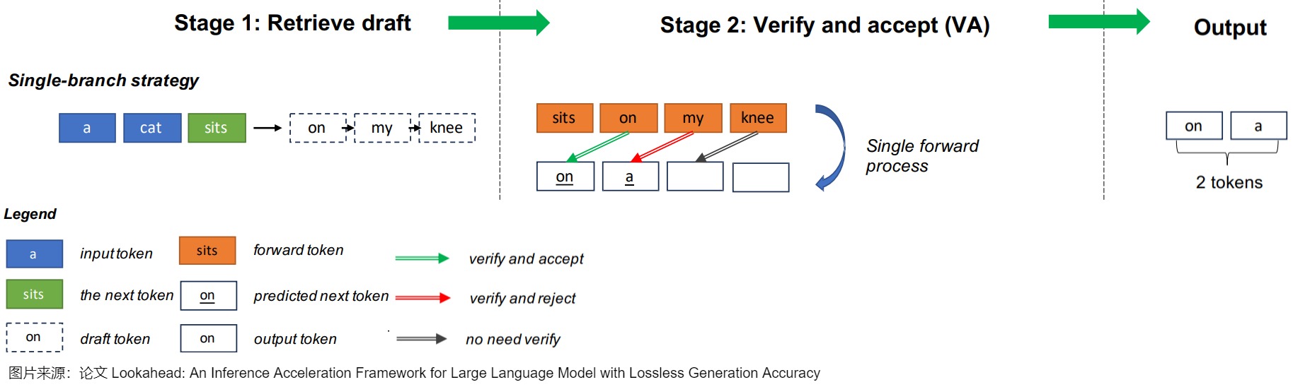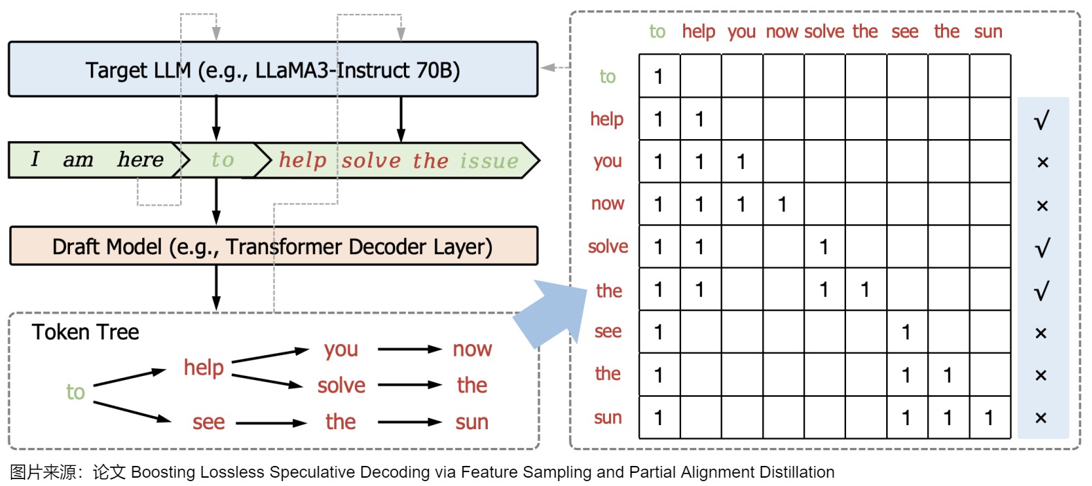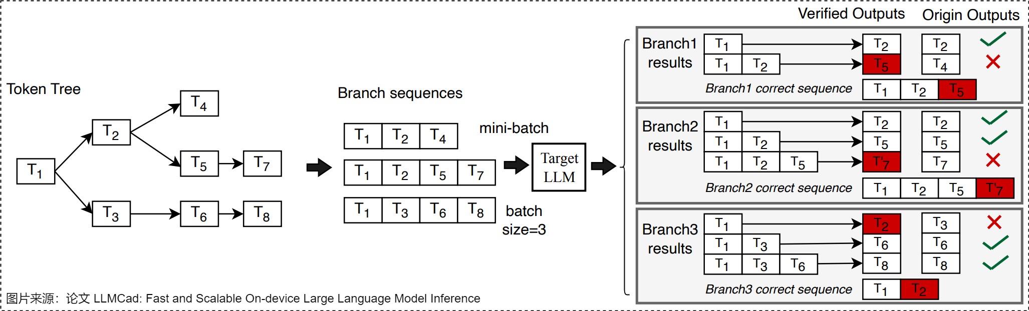 - Accept阶段会接受验证过的最长前缀,附加到原始序列上。此阶段会贪心地选择概率最大的token,如果验证结果的token和Predict阶段预测的token相同则保留。如果不同,则后面的token预测都错误。