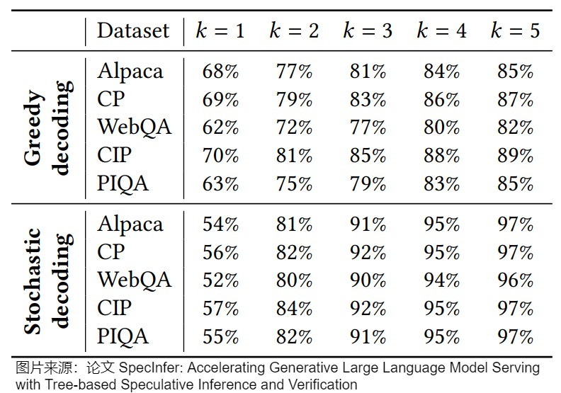论文“SpecInfer: Accelerating Generative Large Language Model Serving with Tree-based Speculative Inference and Verification”发现,大模型验证失败的时候,真实生成的token大多数时候其实也是小参数模型的top-k的tokens。下图展示了使用greedy和stochastic decoding两种方法topK里面k从1到5在各个数据集上的验证成功率。可以看出,尽管预测next next token的top-1准确率徘徊在60%左右,但是在小参数模型每一个step都保留top-5的时候,最后的验证成功率都大大提高。如果使用necleus sampling,top-3的成功率就已经超过了90%。
