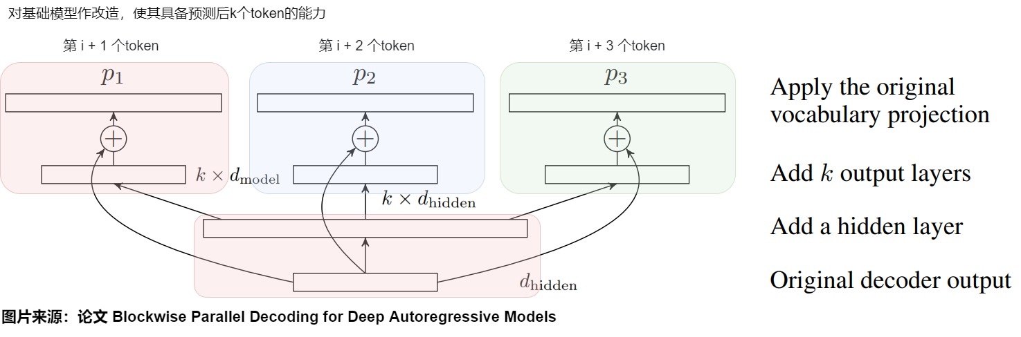 - 但是如何打破串行解码魔咒,并行产生后k个token?因为语言模型都是预测下一个token,如果我们有k-1个辅助模型,每个模型可以根据输入序列跳跃地预测后2到k个位置的token。那么,辅助模型和原始模型就有可能独立运行,从而并行生成后k个token。