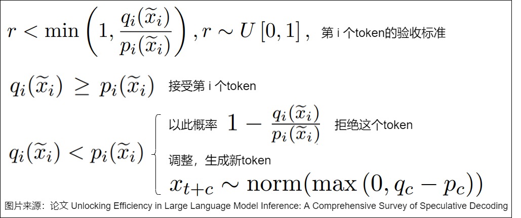 投机解码无需对输出进行任何更改,就可以保证和使用原始模型的采样分布完全相同,因此和直接用大模型解码是等价的。下图右侧,草稿模型先生成5个预测token后,将5个token一起输入给目标模型。以该前缀作为输入时,目标模型会生成若干token,然后进行验证。绿色表示草稿模型生成的token和目标模型生成的token一致,预测token通过了“验证”——这个token本来就是LLM自己会生成的结果。红色token是没有通过验证的“推测”token。第一个没有通过验证的“推测”token和其后续的“推测”token都将被丢弃。因为这个红色token不是LLM自己会生成的结果,那么前缀正确性假设就被打破,这些后续token的验证都无法保证前缀输入是“正确”的了。