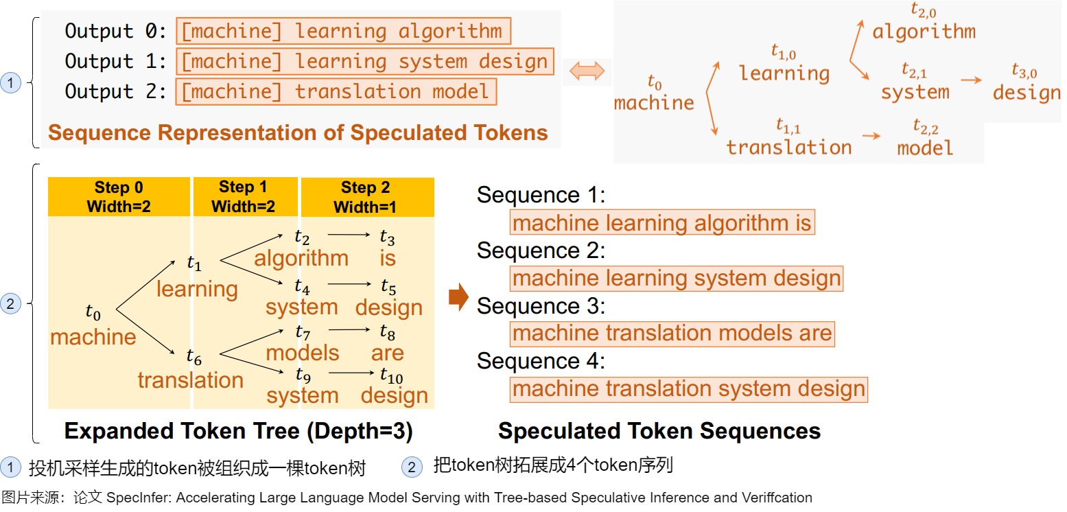 先为每个 SSM 生成了一棵输出树,即在每个 token 取若干种可能性构成一棵树,之后将这些树合并成一棵更大的树。当生成更大的树之后,把该树拓展成若干个token序列。