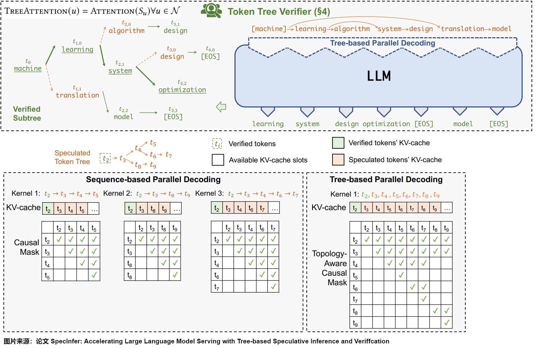 为了解决上述问题,SpecInfer设计了 Tree Based Parallel Decoding 机制。其核心思路为:通过一系列小模型 SSM(Small Speculative Model)联合预测 LLM 输出,并将这些小模型的预测输出组织为 Token 树,树中每个分支表示一个唯一的候选 Token 序列。最后,LLM 使用基于树的并行解码(Tree-Based Parallel Decoding)机制来并行的验证 Token 树中所有 Token 的正确性,这里树的解码算法还可以重用这些序列之间共享的中间结果。SpecInfer 使用 LLM 作为 Token 树验证器而非增量解码器,这显著降低了生成式 LLM 的端到端延迟,同时可以保持模型的质量。