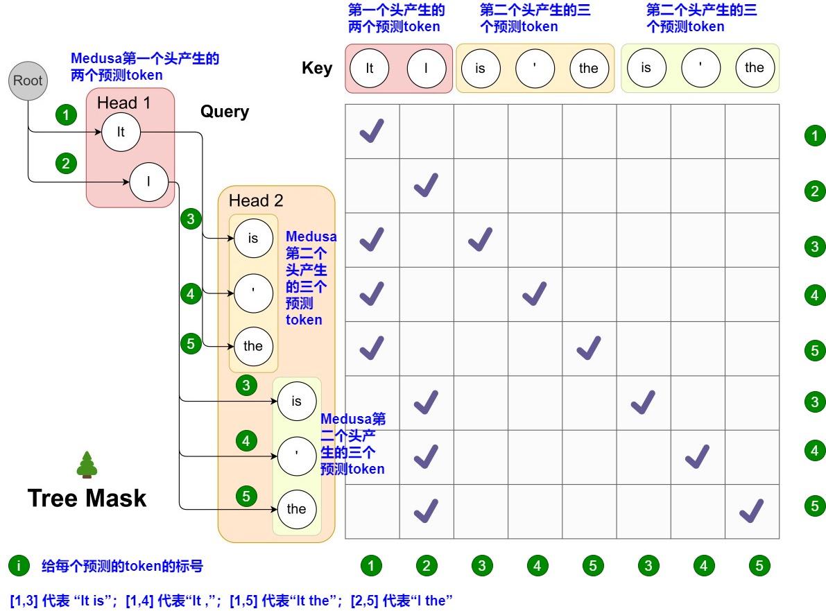 Medusa 中的 Attention Mask 矩阵如下图所示。左侧给出了候选序列。而其对应的 Attention Mask 矩阵如右侧所示。在图上,Head 1 在下一个位置生成 2 个可能的 Token(It 和 I),Head 2 在下下一个位置生成 3 个可能的 Token(is,’ 和 the)。因为第一个头部的任何预测都可以与第二个头部的任何预测配对,这样下一个位置和下下一个位置就有了 2 x 3 = 6 种可能的候选序列,最终形成一个多层树结构。这棵树的每一层都对应于一个Medusa Head的预测。在这棵树内,Attention Mask只限制一个token对其前面token的注意力。