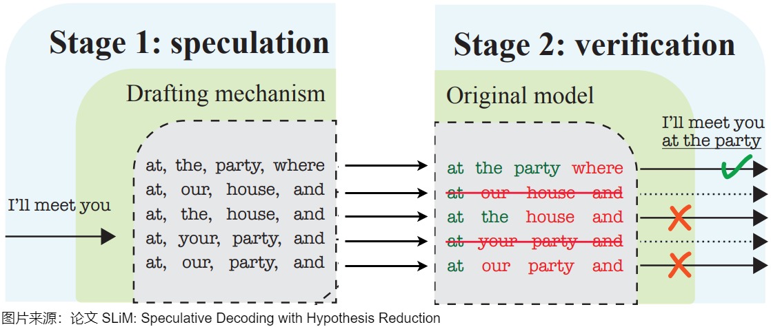 投机解码(Speculative Decoding)允许我们将在同一个用户请求内的多个 Token 一起运算。其目的和 dynamic batching 类似,也是为了将矩阵乘向量重新变为矩阵乘操作,这很适合无法获得更大 Batch size 或者只想降低端到端延时的场景。投机解码一般使用两个模型:Draft Model(草稿模型)快速生成多个候选结果,然后Target Model(目标模型)并行验证和修改,最终得到满意答案。具体而言: