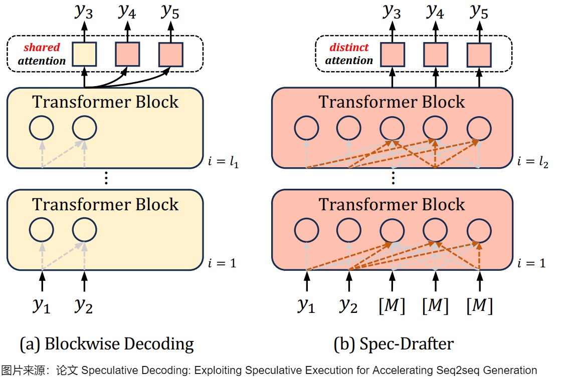 Speculative Decoding 希望解决的是现有的 Autoregressive 模型推理过慢的问题。下图(a)是Blockwise Decoding,其在目标自回归模型上引入了k − 1个FFN头,这些头使用共享注意力(shared attention)来预测下面k个tokken。(b)是Spec-Drafter模型,该模型是预测草稿token的独立模型,它使用不同的query来预测每个草稿token。下图上黄色部分是自回归AR模型,红色部分是新加入的模块。