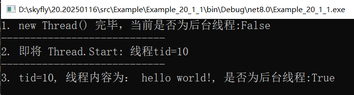 Console.WriteLine($"1. new Thread() 完毕,当前是否为后台线程:{thread.IsBackground}");