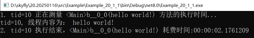 Console.WriteLine($"2. 线程执行结束,{methodName} 耗费时间:{stopwatch.Elapsed.ToString()}");
