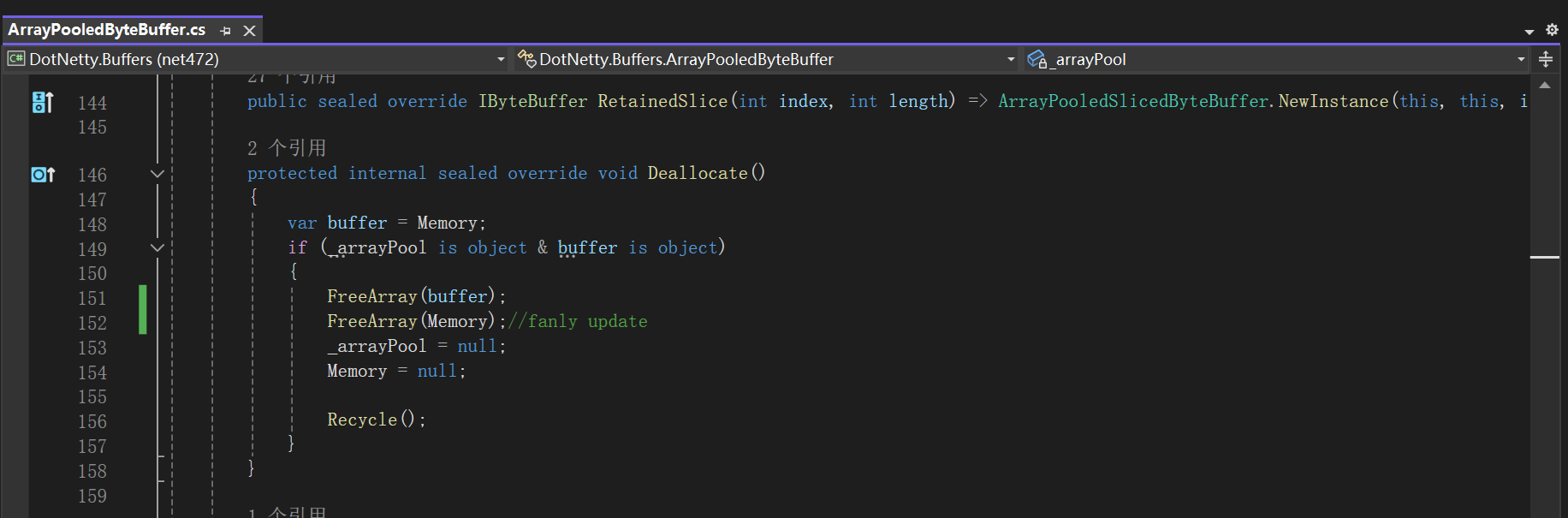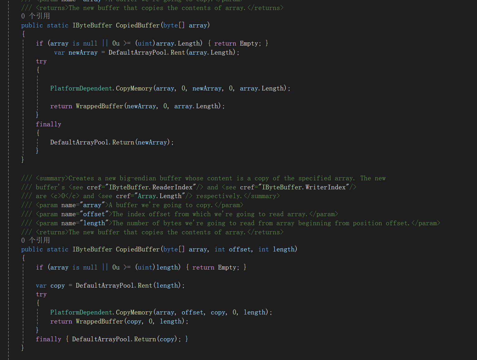 看byte[] 里面还有ArrayPool,在我印象当中,surging 只有httpkestrel 文件上传下载功能的时候,在StreamCopyOperation类中使用过,其它一概也没有使用,对于ArrayPool<byte>.Shared.Rent获取的buffer,我后面都 ArrayPool<byte>.Shared.Return掉了啊。是不是dotnetty 出现的问题呢?然后我全局寻找到了,在ArrayPooled和ArrayPooledByteBuffer文件下buffer 没有return 还回去