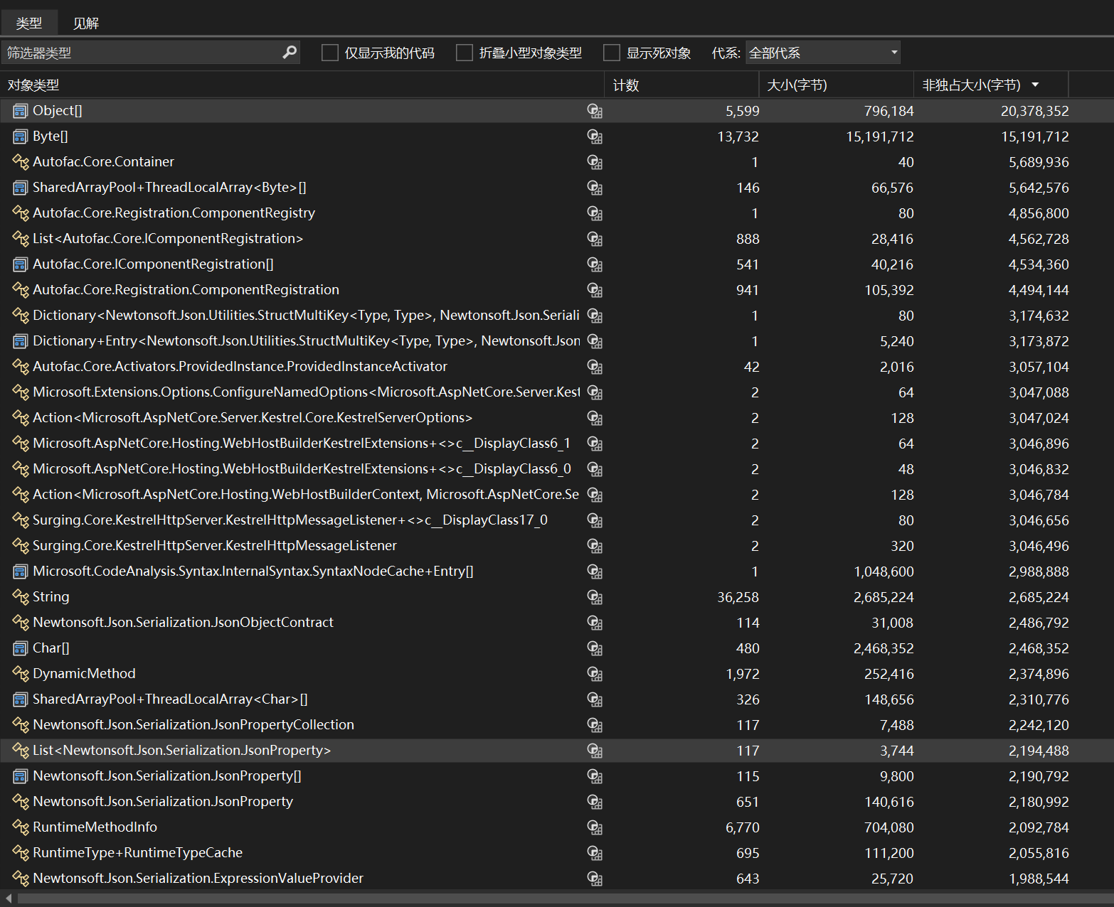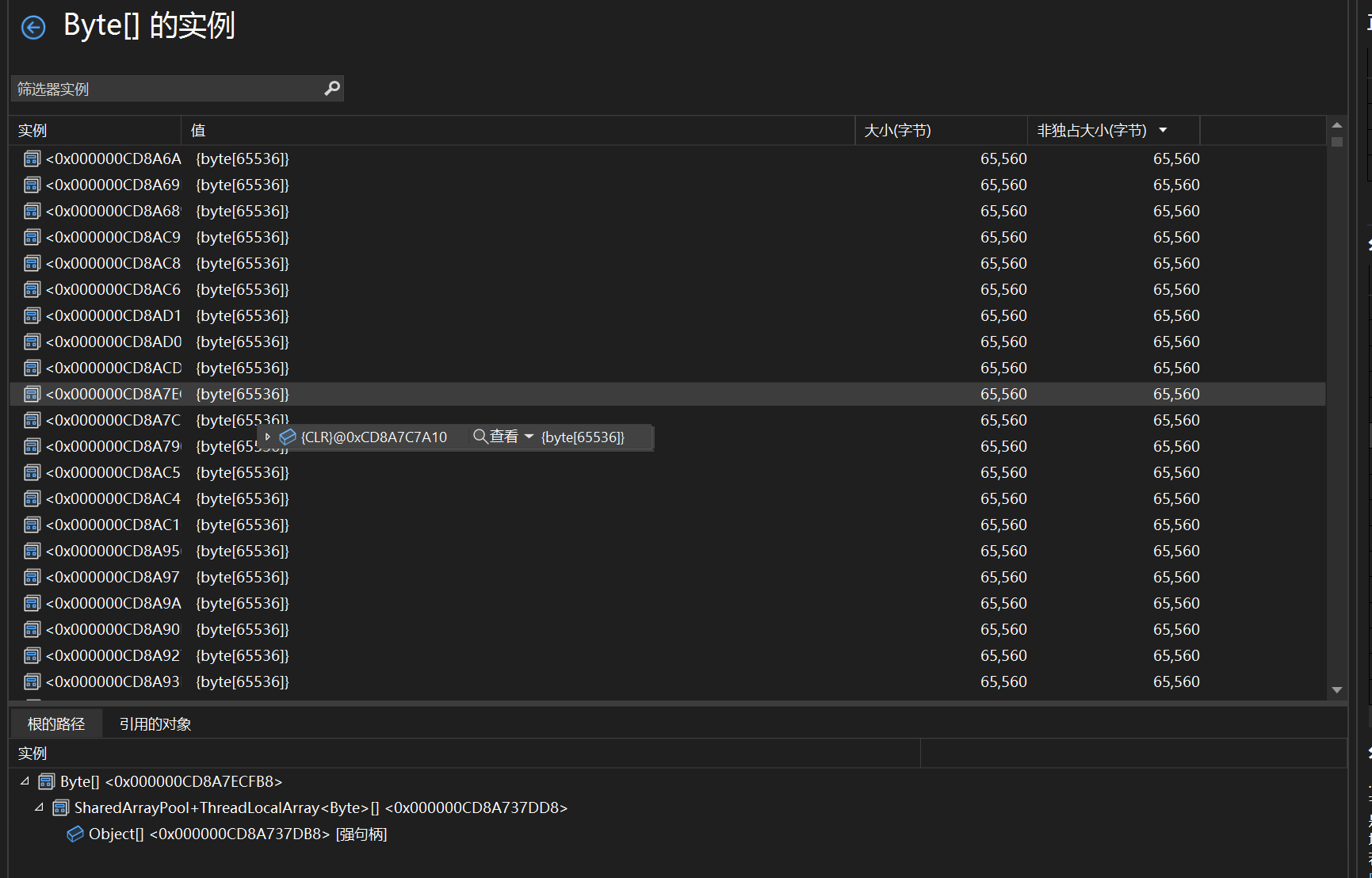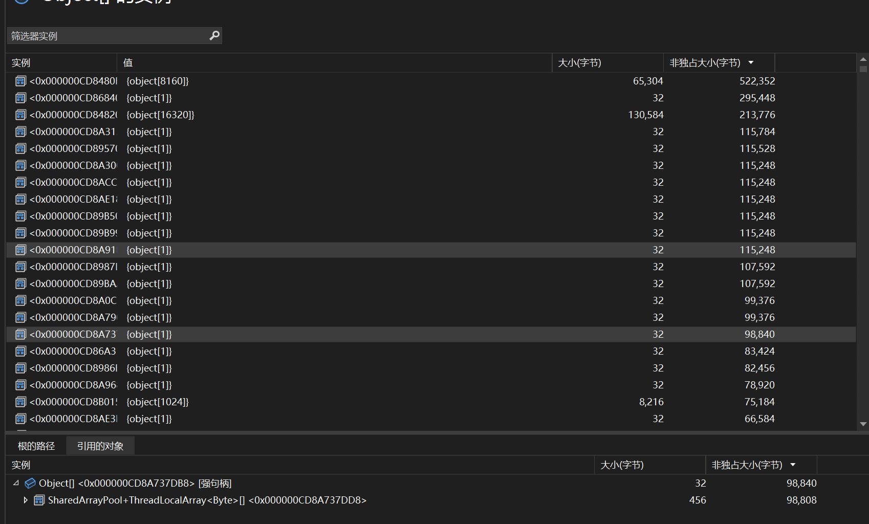 从托管对象来看,除了autofac, object[] ,byte[],ArrayPool都很可疑,然后我们先来看看object[],byte[]是什么玩意