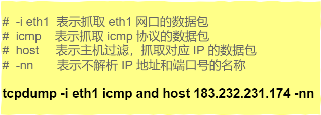 要抓取上面的 ping 命令数据包,首先我们要知道 ping 的数据包是 icmp 协议,接着在使用 tcpdump 抓包的时候,就可以指定只抓 icmp 协议的数据包: