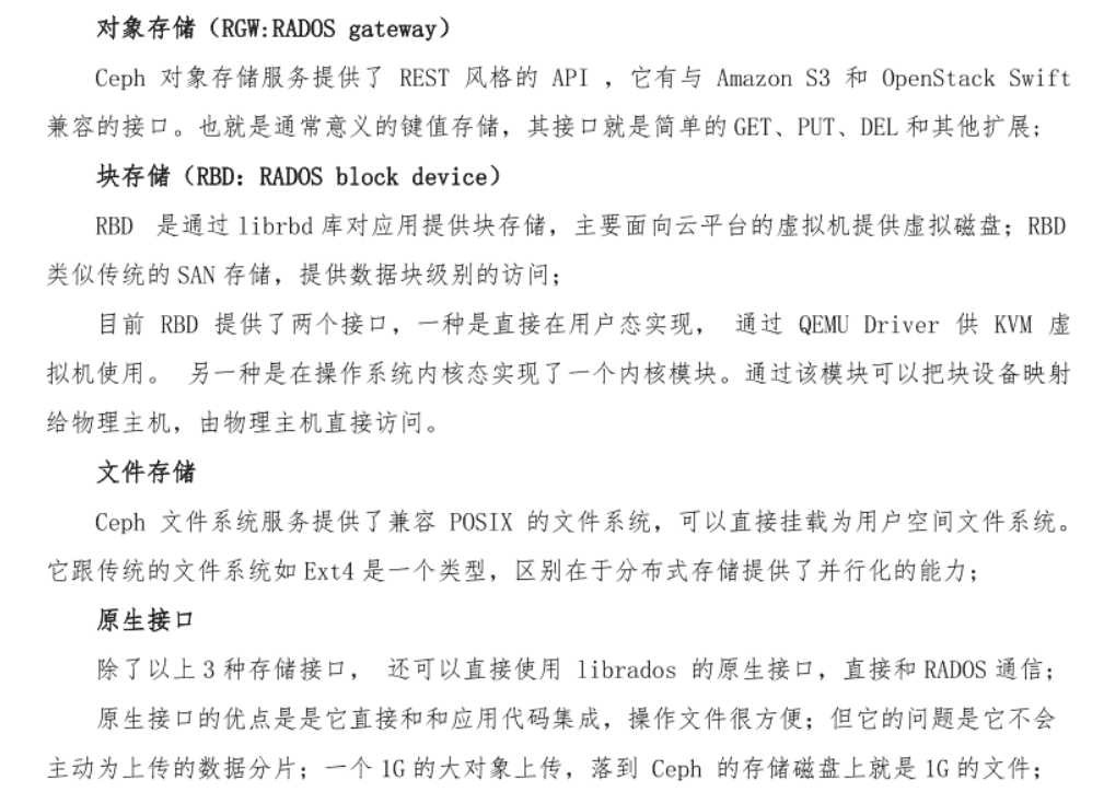 Ceph能够提供企业中三种常见的存储需求:块存储、文件存储和对象存储,Ceph在一个统一的存储系统中同时提供了对象存储、块存储和文件存储,即Ceph是一个统一存储,能够将企业企业中的三种存储需求统一汇总到一个存储系统中,并提供分布式、横向扩展,高度可靠性的存储系统,Ceph存储提供的三大存储接口: