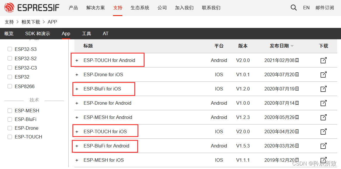 本文将会测试说明 Smart_config 和 BlueIF 两种配网方式, 在进行下面测试之前,我们可以先在手机端准备好需要的 App。 APP可以在乐鑫官网下载,链接如下: