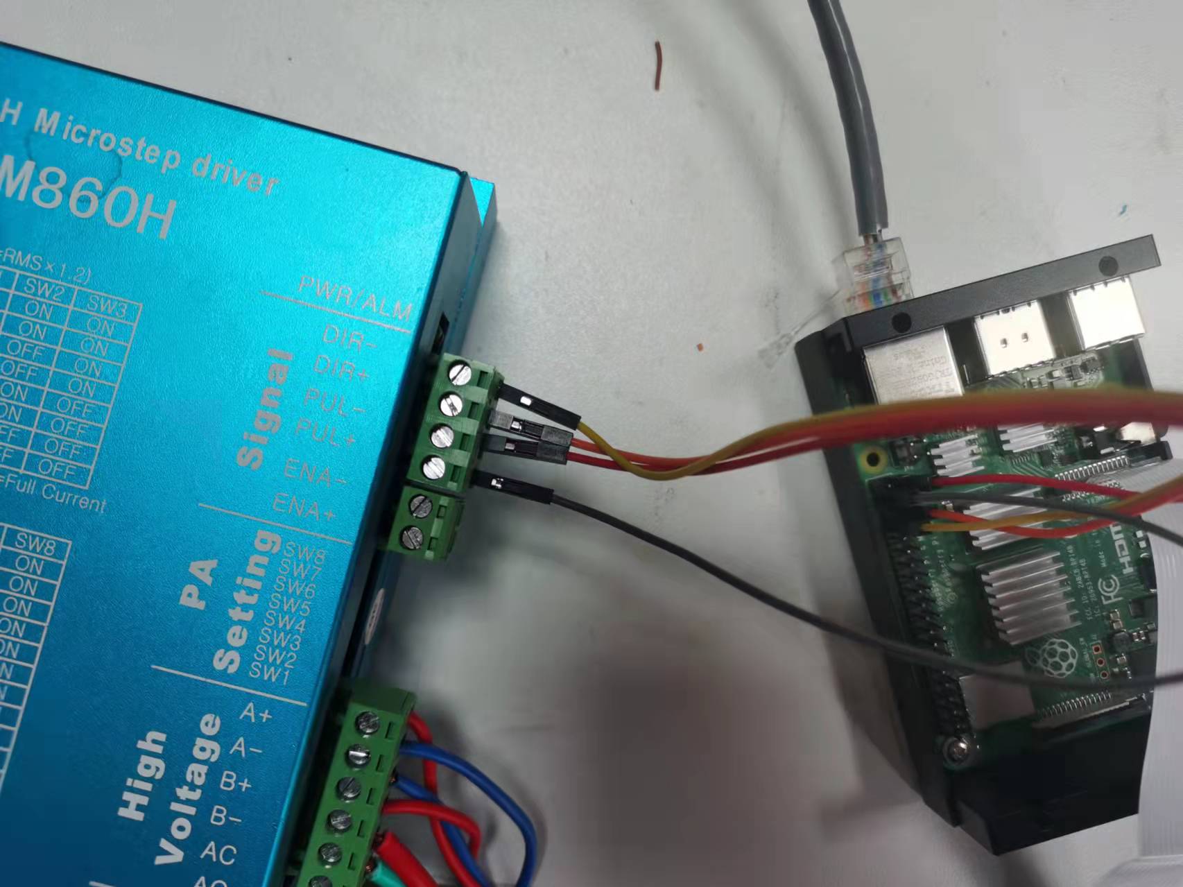 树莓派驱动步进电机 步进电机一般由电机、驱动器构成,树莓派连接驱动器控制电机。一、接线DIR+/- 用于控制方向,PUL+/- 用于控制转动;正极DIR+ 和 PUL+ 接到GPIO口,两个负极接到GPIO口或地线均可,控制的时候不使用。实验中,DIR+ 接35口,PUL+ 接38口。树莓派4B GPIO口如图所示远离树莓派USB的一侧 是 1、2、3号口二、驱动DIR控制方向,使用高电平或低电平控制;PUL控制转动,使用脉冲驱动。三、代码import RPi.GPI.