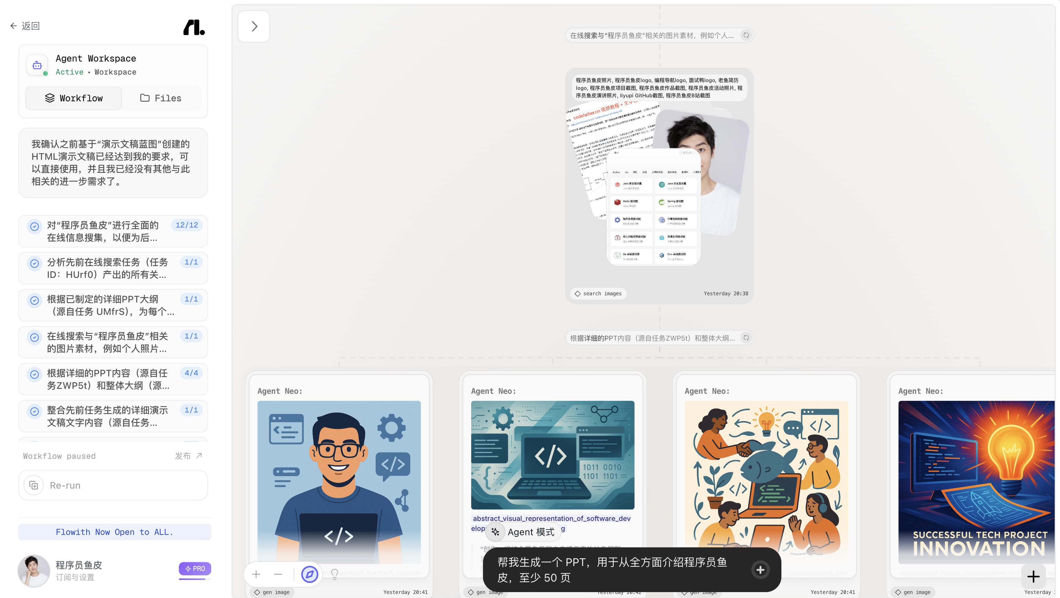 AI 在给 PPT 准备图片素材时也很聪明,不仅从网络上搜索到了图片,而且还调用其他的 AI 绘图大模型并行生成了多张配图。实话说,这个小卡片的效果确实惊艳到我了,前端开发加个鸡腿!
