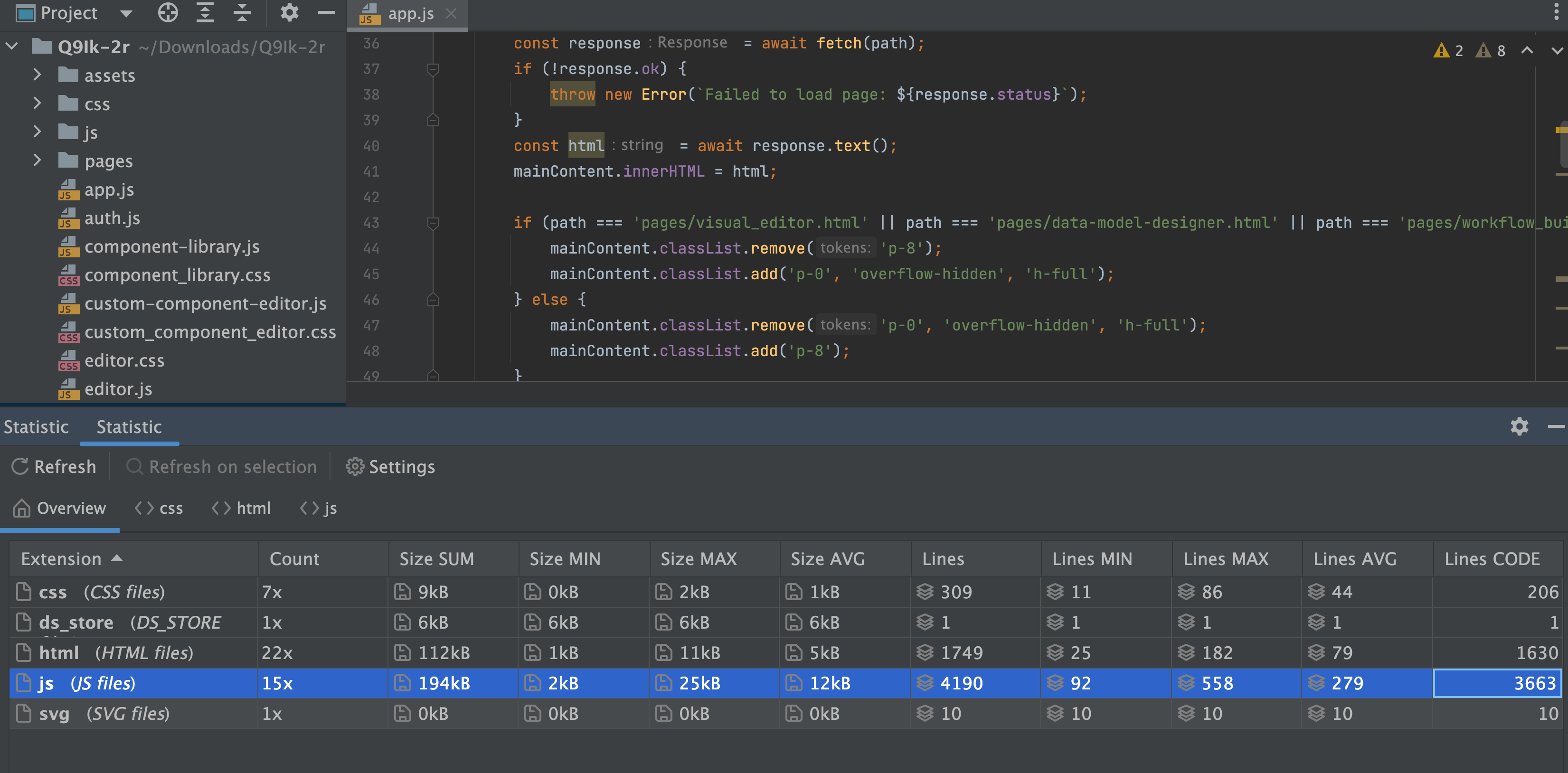 再看看生成的项目代码,页面文件还算完整,生成了 5000 多行代码,属于中小型项目的规模。