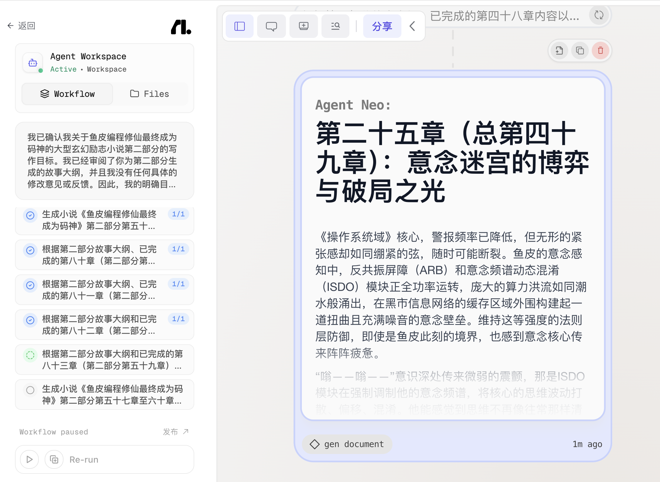 AI 首先就意识到,这个任务很艰难,想要分阶段生成。虽然大模型上下文长度最多支持百万字,但只要我们把千万字拆分成 N 个百万字,每个百万字单独当做小说的一卷来生成,生成下一卷时不需要把上一卷的所有内容作为上下文,而是传递一些关键信息和线索就够了。这样一来,理论上任务是可以顺利完成的~