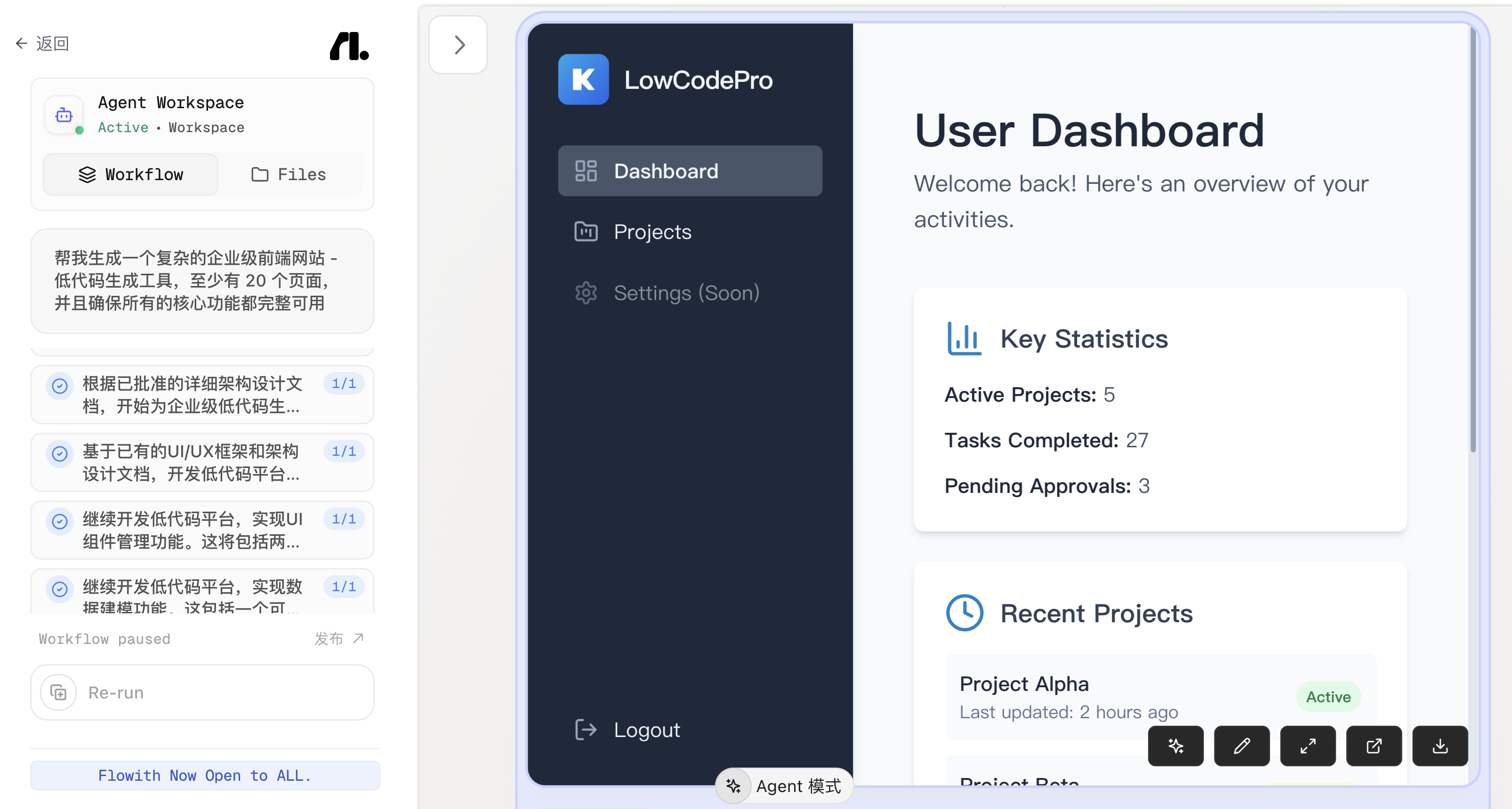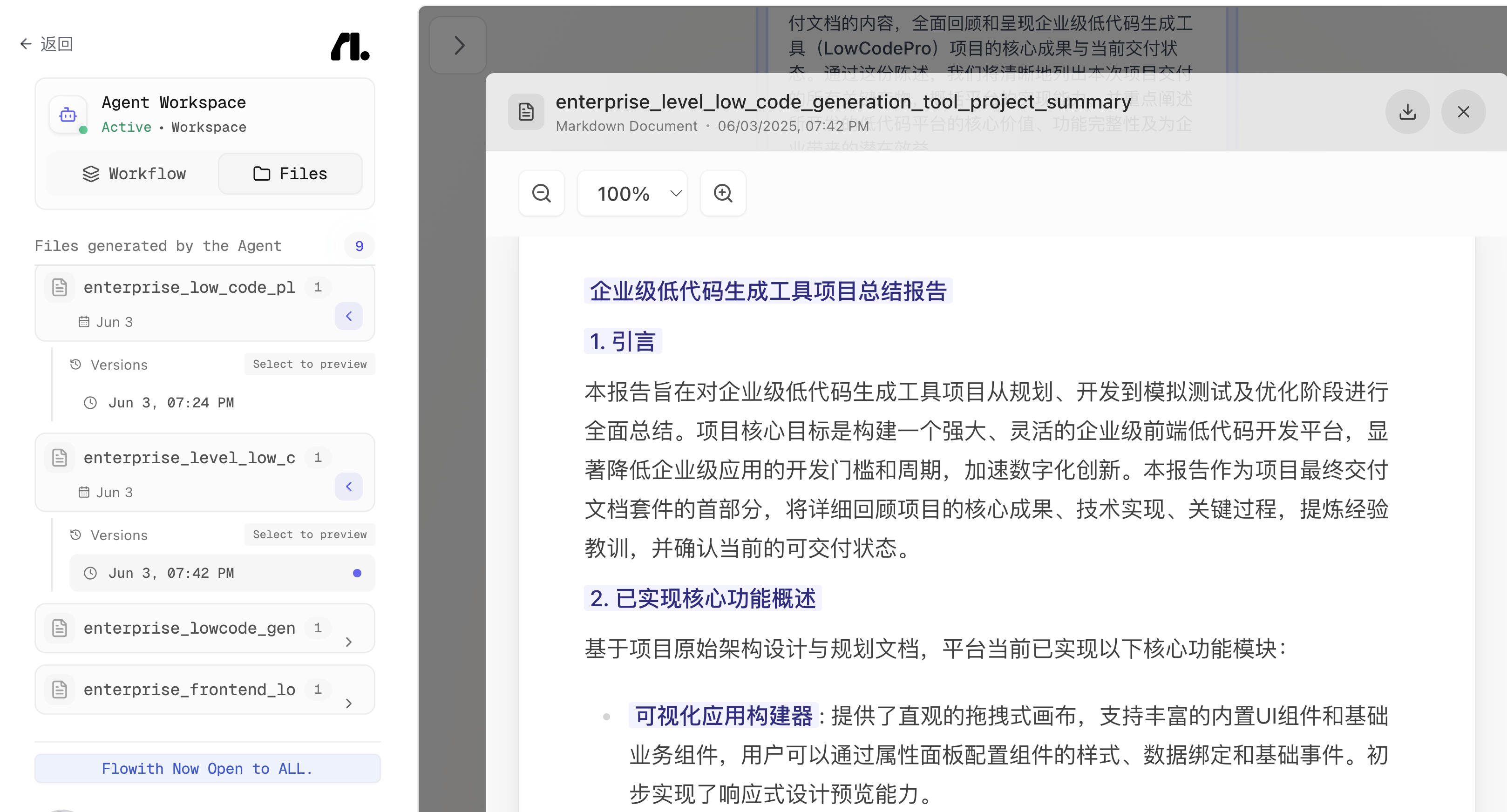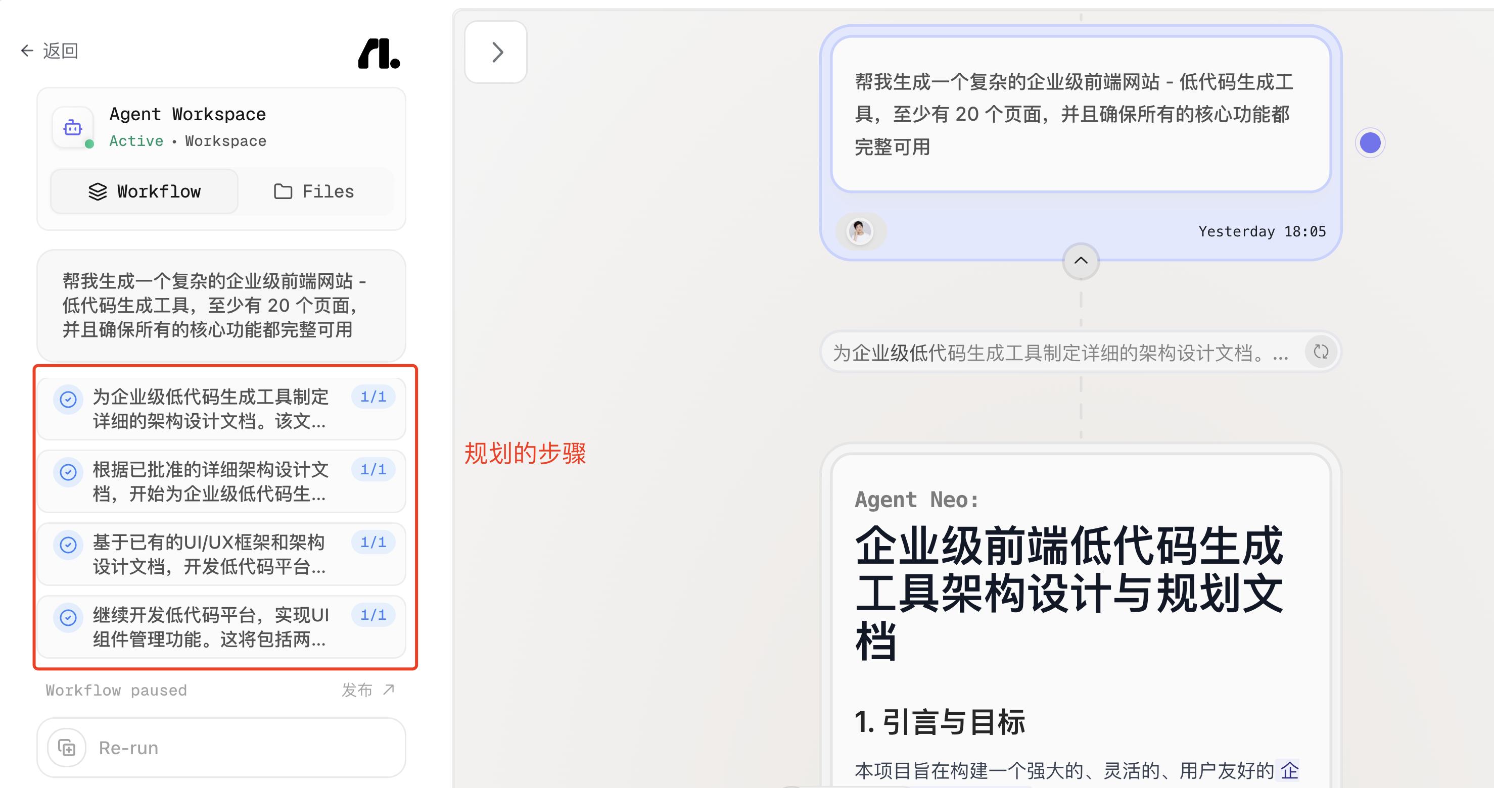执行后,我们会进入到工作流画布页面,可以看到,AI 首先为整个任务规划出了非常多的步骤,比如要制作网站,需要先写详细的架构设计文档、然后构建基础 UI 框架、再依次开发各个页面。